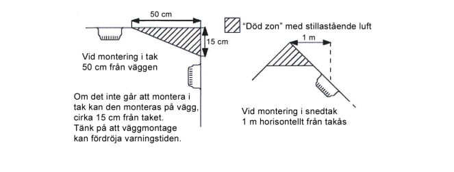 Brandvarnaren bör placeras i taket, om möjligt minst 50 cm från vägg. Är taket snett bör brandvarnaren placeras en meter horisontellt från takås. Om brandvarnaren måste placeras på väggen bör den sitta ca 15 cm från taket. I figuren nedan illustreras de olika placeringarna av brandvarnaren. Figuren är hämtad från MSB.